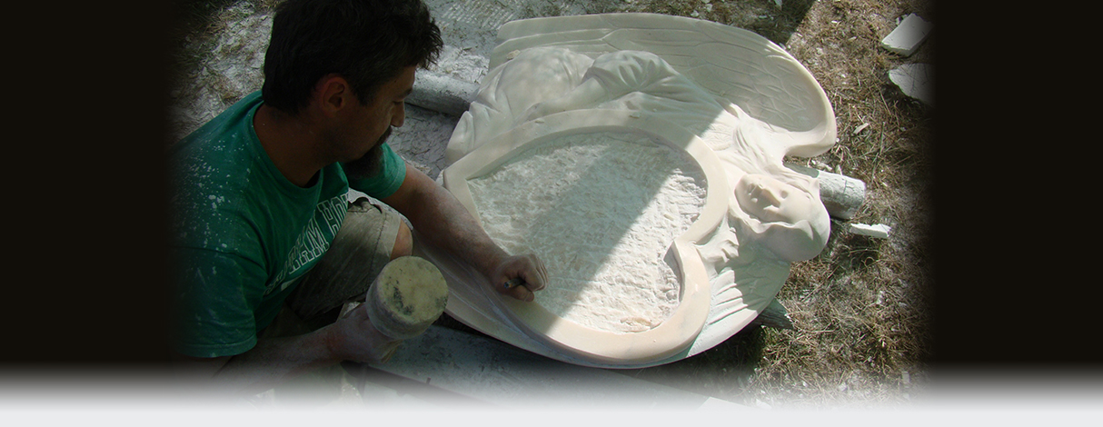 Monument funerar cu inger cioplit in marmura si cu inima de granit negru